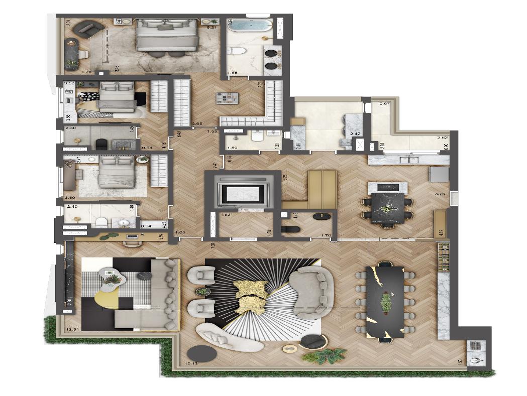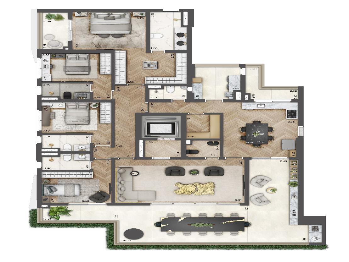 Design imponente e sofisticado, de fachada viva, com floreiras com irrigação automatizada. Áreas de lazer equipadas e elegantemente decoradas, piscina coberta com raia de 25m, SPA com sauna seca e sauna úmida, piscina externa, solários, piscina infantil, playground, brinquedoteca, quadra de tênis, fitness, salão de festas com lounge externo, e elegantes praças de convívio.